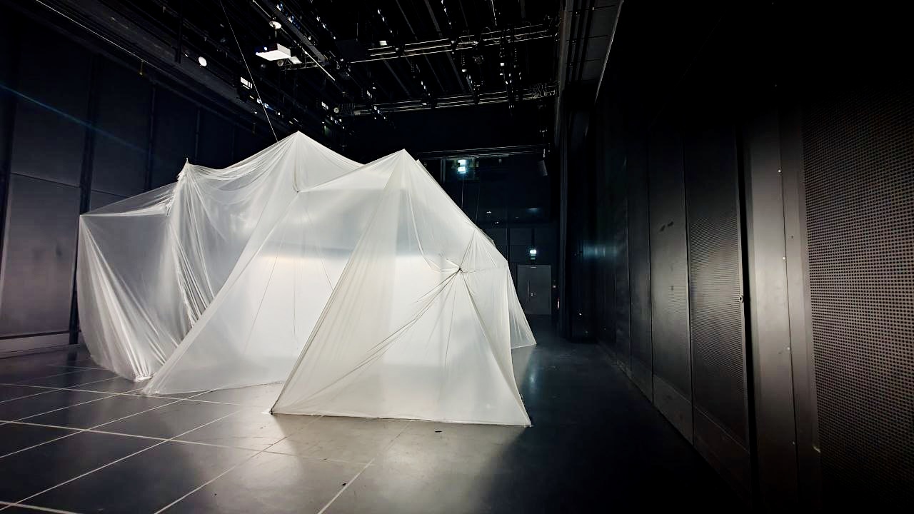 Anstelle jedoch das Dispositiv einer ‚klassisch (natur-)wissenschaftlichen‘ Ausstellungsgestaltung zu bemühen, resultierte die achtmonatige Auseinandersetzung mit Mycelium und dessen Kultivierung in einer multi-medialen Installation, die zwischen Fremdheit, Affizierung und Mehrstimmigkeit oszillierte. So entfaltete sich eine halbtransparente, amorphe Form im Dunkeln während Visuals wachsender Hyphenfäden an den Wänden entlangkrochen. In der Mitte des Gebildes prangte ein leuchtend-weißer Würfel, dessen Inneres an ein steriles Labor erinnerte. Um hineinzugelangen, mussten sich die BesucherInnen selbst einem „Reinigungsprozess“ unterziehen, indem sie weiße Schutzanzüge, klinische Handschuhe und Schuhüberzieher anlegten. Wer nun genau sich vor wem in diesem utopisch-dystopischen Arrangement schützte, blieb bewusst unbeantwortet. So wandelten die Gäste in jener szenografischen Ambiguität aus wissenschaftlich-aufklärerischem White-Cube und dunkel affizierender Blackbox während eine anschwellende, polyphone 4-Kanal Soundebene die Szenerie untermalte.